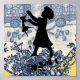 Vintage image of girl dancing silhouette on blue yellow toile print...