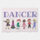 Original hand-illustrated marker and pen-and-ink "dance class" design features a row of cute cartoon dancers. Dance styles shown include jazz, acro, tap, ballet, hip hop, and lyrical. Perfect for your favourite dancer, studio, teacher, or dance team, or as a fun recital gift.