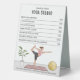 Price list design for a yoga studio or for a yoga instructor offering lessons for customers. There are multiple personalizable text areas ideal for membership offers and class prices. The top has two personalizable text areas for the business name while on the bottom there is Destei's original artwork featuring a yoga woman doing the dancer's pose. Next to the woman there is a green leafy plant and a yellow colour exercise ball. The yogini stands on a pinkish colour yoga mat. The very bottom has another personalizable text area perfect for business website address and other contact information.