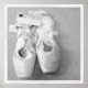 Black and white photo of ballet shoes.