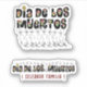 * Dancing skeletons and decorative sugar skulls, within the text design.