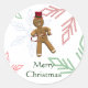 A fun sticker for the holidays with a cute cartoon gingerbread man dancing in his festive red top hat and candy cane against a background of colourful snowflakes. The words "Merry Christmas" can be easily changed to any message of your choosing.