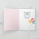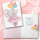 Here's a cute birthday card for any child! The front features a grey elephant dressed up in a pink tutu and ballet slippers. She holds a string with three brightly coloured balloons. The inside of the card has text fields in grey and teal for you to customise or leave as is. It also has a second image of the balloons.