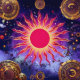 “Dancing Fire of the Cosmos” The Sun. The sun’s hypnotic swirls and golden flares give the illusion of movement, as if the solar flames are alive. An intricate masterpiece celebrating energy, warmth, and celestial balance with colours of red, orange, yellow and blue.