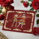 Two debonair harlequin dancers gracefully perform in vibrant costumes against a regal cranberry-red backdrop, adorned with decorative golden garlands and surrounded by delicate musical notes. Original illustration by Noël Snow.
