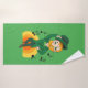 Bath Towel with an Illustration of a smiling happily dancing leprechaun wearing a green suit, a bow-tie, and a bowler hat; with black notes and a yellow and orange rainbow in green background.