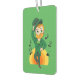 Air Freshener with an Illustration of a smiling happily dancing leprechaun wearing a green suit, a bow-tie, and a bowler hat; with black notes and a yellow and orange rainbow in green background.