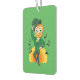 Air Freshener with an Illustration of a smiling happily dancing leprechaun wearing a green suit, a bow-tie, and a bowler hat; with black notes and a yellow and orange rainbow in green background.