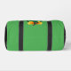 Duffle Bag with an Illustration of a smiling happily dancing leprechaun wearing a green suit, a bow-tie, and a bowler hat; with black notes and a yellow and orange rainbow in green background.