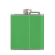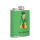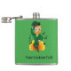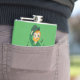 Flask with an Illustration of a smiling happily dancing leprechaun wearing a green suit, a bow-tie, and a bowler hat; with black notes and a yellow and orange rainbow in green background.