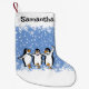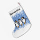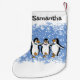 Dancing Penguins Design Christmas Stocking with customisable background colour and text.