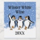 Dancing Penguins Design Wine Label on a snowy background, with customisable text and colour.