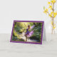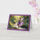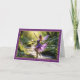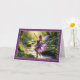 The card features a beautiful young fairy with delicate, translucent wings and flowing red hair, wearing a purple dress that flows gracefully as she dances in a serene, sunlit forest. The lush greenery, soft moss, and gentle stream in the background create a magical, enchanting setting. The border of the card is a rich purple with elegant golden floral designs that enhance the fairy-tale theme. The words "Happy Birthday" are elegantly scripted at the bottom, adding a touch of charm and joy to the scene.