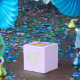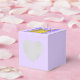 Birthday party favour boxes with a heart window and two squirrels dancing on a cake.