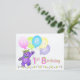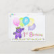 A purple teddy bear princess dressed up in a lovely yellow jewelled crown and pink, blue and green flowers is dancing through the flowers and holding a bunch of colourful balloons with the word HAPPY on them. This happy birthday postcard will bring a smile to a special girl on her 1st birthday. Personalise with her name to make it extra special. Original design by Anura Design Studio.