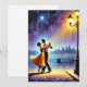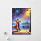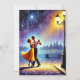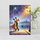 This captures the romantic scene of a couple dancing under the lamppost with the city backdrop.