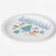 Paper plates with a whimsical forest scene. Happy forest animals dancing around a green fir tree with presents underneath.
