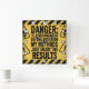 This bold, humourous warning sign features "DANGER:" atop a distressed yellow background with black hazard stripes. The assertive message reads: "TO AVOID ARGUMENT / DO NOT QUESTION / MY METHODS / JUST ENJOY THE / RESULTS" in stark black lettering. Skull and exclamation mark warning triangles reinforce its no-nonsense, edgy appeal.