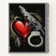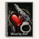 This vintage black-and-white illustration showcases a handcuff and handgun alongside a bleeding red heart, set against a dark background with soft light accents. The gold touches add elegance, capturing the intense themes of love and conflict.