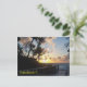 A photograph of the sun rising at Dania Beach, Florida. There are silhouettes of palm trees and sea grape; also you see a boardwalk leading out towards the ocean. In the lower left corner of the postcard is the name of the location, in a yellow font.