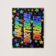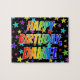This fun, lively, birthday-themed jigsaw puzzle design features the message "HAPPY BIRTHDAY, DANIEL" with the characters having a colourful rainbow spectrum inspired gradient pattern, in addition to a vibrant star field background pattern. An exciting puzzle like this might be used to send a birthday greeting message to somebody named Daniel. [~Z0000468]