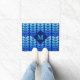 Doormat in a Mid-Century Modern Danish inspired textile pattern of stylised leaves - shades of blue, from light sky blue to deep cobalt, accented with white, on a dark navy / indigo blue background ,with monogram