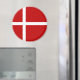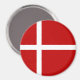 The red and white flag of Denmark, or Dannebrog, has a Nordic or Scandinavian Cross. The red is the background, the cross is in white. The Danish flag shows here on a round magnet.