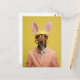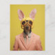 A stylish dachshund dressed for Easter in a pastel pink suit, striped tie, and yellow bunny-eared helmet, exuding charm and whimsy against a bright yellow background. A perfect blend of elegance and humour for a festive Easter celebration.