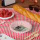 Dapper Easter paper ware for dining. Print of a dapper bunny and girl with coordinating outfits, glasses, and bunny ears. Spring image with green background and collage tree, also includes a rabbit and egg all in collage style.