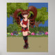 Darby the Roller Derby Fairy is a manga shoujo style faery and she is wearing a red top and skirt with hearts on her knee pads, red and black diamonds on her socks, and flames on her skates. She has black and red wings and big curly pig tails. She is skating near the woods past the beautifully coloured mushrooms. Illustration by KLeighE of Hinterland Harmony Art and Illustrations.
