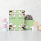 Funny black sheep wrapping paper. A group of white sheep with pink faces and grey ears are surrounding a woolly black sheep, also with a pink face and grey ears. Below is a caption "dare to be different" in black lettering.
