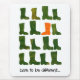 A good quality mousepad with a motivational slogan, 'Dare to be Different', illustrated by one bright orange, red-spotted boot among rows of similar green wellies. A handpainted paper collage suitable for many situations!