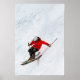 Daring skier heading almost vertically down the hill, his bright red ski jacket standing out against the icy white snow.
