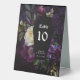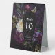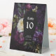 Romantic and moody, this formal wedding table number sign is perfect for a sophisticated modern goth wedding. The moody floral design features a natural bouquet of purple and dusty lavender flowers and blackberries with dark green leaves in a luxurious arrangement on a dark black lace background. The table number details are framed in a coffin shaped box. You can personalise with names and wedding date.