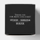 This elegant favour box is designed to leave a lasting impression on your guests. The black background is adorned with vibrant orange and blush florals, complemented by lush greenery, adding a dramatic yet sophisticated touch. The front of the box displays a bold "Thank You" message, while the top reads, “Thank you for being our guest,” which can be customised to your preferred wording. Additionally, the names and date below this message are also customisable, allowing you to add a personal touch to each favour. Perfect for weddings or special events, this box combines style and gratitude in a beautifully unique way.
