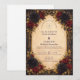 A bold and dramatic design inspired by gothic romance and baroque opulence, featuring deep crimson roses, black dahlias, and rich golden foliage woven into an ornate antique frame. The warm parchment center glows against the dark, moody background, creating a striking contrast that feels both luxurious and timeless. Intricate details and layered florals add depth and intensity, making this design perfect for an unforgettable evening celebration filled with elegance, mystery, and old-world charm.