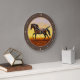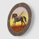 A dark bay wild mustang stallion galloping across dry grassy plains in the eerie light of the low winter sun. Accented with a matching brown patterned background.