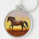 A dark bay wild mustang stallion running across dry grassy plains in the eerie light of the low winter sun. Realistic artwork created from an original oil painting by equine and wildlife artist Crista S. Forest.