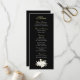 This dark black menu with gold and white script is simply elegant. A floral bouquet graces the bottom of the menu. The couple's names are on the back with a gold ampersand. Perfect for any occasion ... all fields can be customised for your luncheon or dinner. Optional names on back for weddings and anniversaries