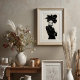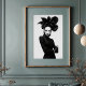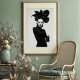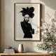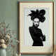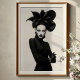 Make a striking statement with this captivating black and white art print, a true masterpiece of avant-garde fashion and artistic expression. This compelling frontal portrait features a woman of intense allure, crowned with an extraordinary, sculptural black hat that unfolds like a dramatic, dark blossom. Dressed in a sleek black turtleneck, complete with elegant leather gloves and shimmering silver bracelets on one wrist, her attire is a study in sophisticated minimalism. Her pale skin, stark black lips, and dramatically winged eyes create a mesmerising contrast against her dark ensemble and the pristine white background, emphasizing her powerful and direct gaze. With arms confidently crossed, this artwork embodies a fierce, mysterious, and undeniably chic elegance. Perfect for modern living spaces, fashion studios, or any decor seeking a touch of unique sophistication, bold artistry, and a truly unforgettable visual narrative.