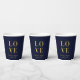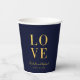 These Dark Blue Faux Gold Love paper cups feature the words "Love" in faux gold foil against a dark blue background. Perfect for engagement parties, weddings and anniversaries.