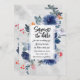 Wedding Save the Date depicts an elegant floral watercolor design with dark blue flowers and red berries on a grey background. The back features Bible Verse Song of Solomon 3:4, "I have found the one whom my soul loves."