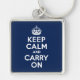 "Keep Calm and Carry On" against a deep sea navy blue.