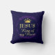 Elegant midnight blue JESUS KING OF MY HEART Throw Pillow, showing a gold coloured crown and faux gold typography at the centre, inside a deep purple wreath. In the background the text says KING OF KINGS in a subtle tiled pattern, which continues on the back. This would make a beautiful addition to your Christmas home decor, and a wonderful, stylish gift throughout the year.