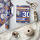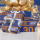 Navy blue and contrasting orange birthday photo template wrapping paper. Graphic wrapping paper customise with your own name and three photos of your birthday girl or boy. Other matching items are available. Unique design by Sarah Trett for www.mylittleeden.com