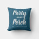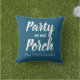 Style your patio with this fun phrase pillow "party on our porch" followed by family last name. Makes a great gift idea and customisable blue colour background.