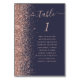 The left-hand edge of this elegant modern wedding table number card features a rose gold faux glitter border. The word "table" appears in rose pink whimsical handwriting script on a dark blue background. Add the names of your guests who are assigned to each table.