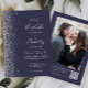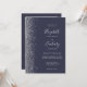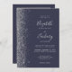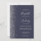 The left-hand edge of this elegant modern wedding invitation features a silver faux glitter design. The customisable text combines silver grey handwriting, copperplate and italic fonts on a dark blue background. Add your favourite photo to the reverse side, along with additional text and a QR code to send guests to your wedding website.