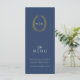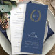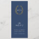 Dark navy blue, white and gold coloured wedding dinner menu. Edit this 4 course menu with your own meal option wording. Modern yet classical hand drawn oval leaves and monogram design. © Original oval hand drawing and design by Sarah Trett for www.mylittleedenweddings.com exclusively on zazzle.
