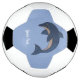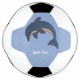 This soccer ball has a jumping dark blue and white dolphin with tiny white flecks giving it a faux glitter look on a light blue background. Customise your text with the template.
